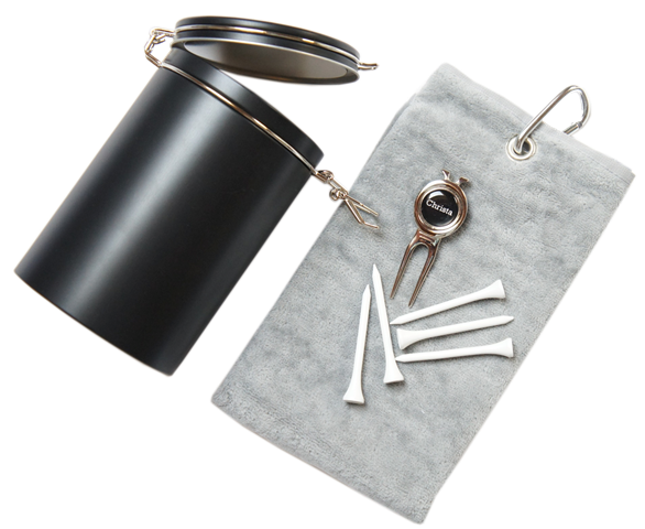 Geschenk-Dose: Caddytuch + Pitchgabel mit personalisiertem Ballmarker