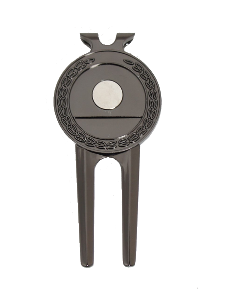 Pitchgabel, 80 x 35 mm, aus Metall mit Gürtelclip und Magnet für Ballmarker Ø 25mm, in edlem metallic-schwarz.