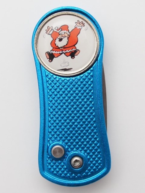 Aufklappbare Pitchgabel, 70 mm x 28 mm x 10 mm, aus Aluminium. Mit einem Magneten für Ballmarker.