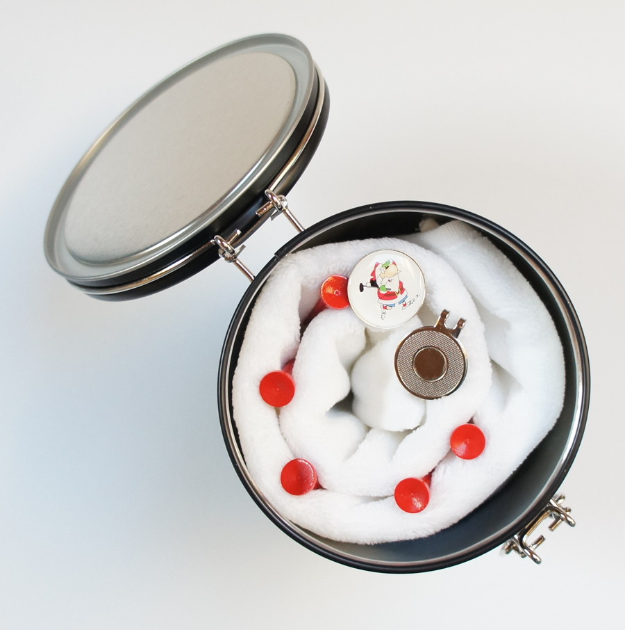 Geschenk-Set, bestehend aus: Hochwertiges Velours-Golftuch, 100 % Baumwolle, Gr. 40 x 50 cm, 3-fach gefaltet mit Öse und Karabinerhaken Cap-Clip, Ø 30 mm, aus Metall mit Magnet für Ballmarker, Farbe: silber Ballmarker aus Metall mit Kunststoffbeschichtung mit Logo NIKOLAUS 5 rote Tees aus Holz Verpackt in einer formschönen silberfarbenen Dose aus Metall, Gr. 150 x 150 x 54 mm.